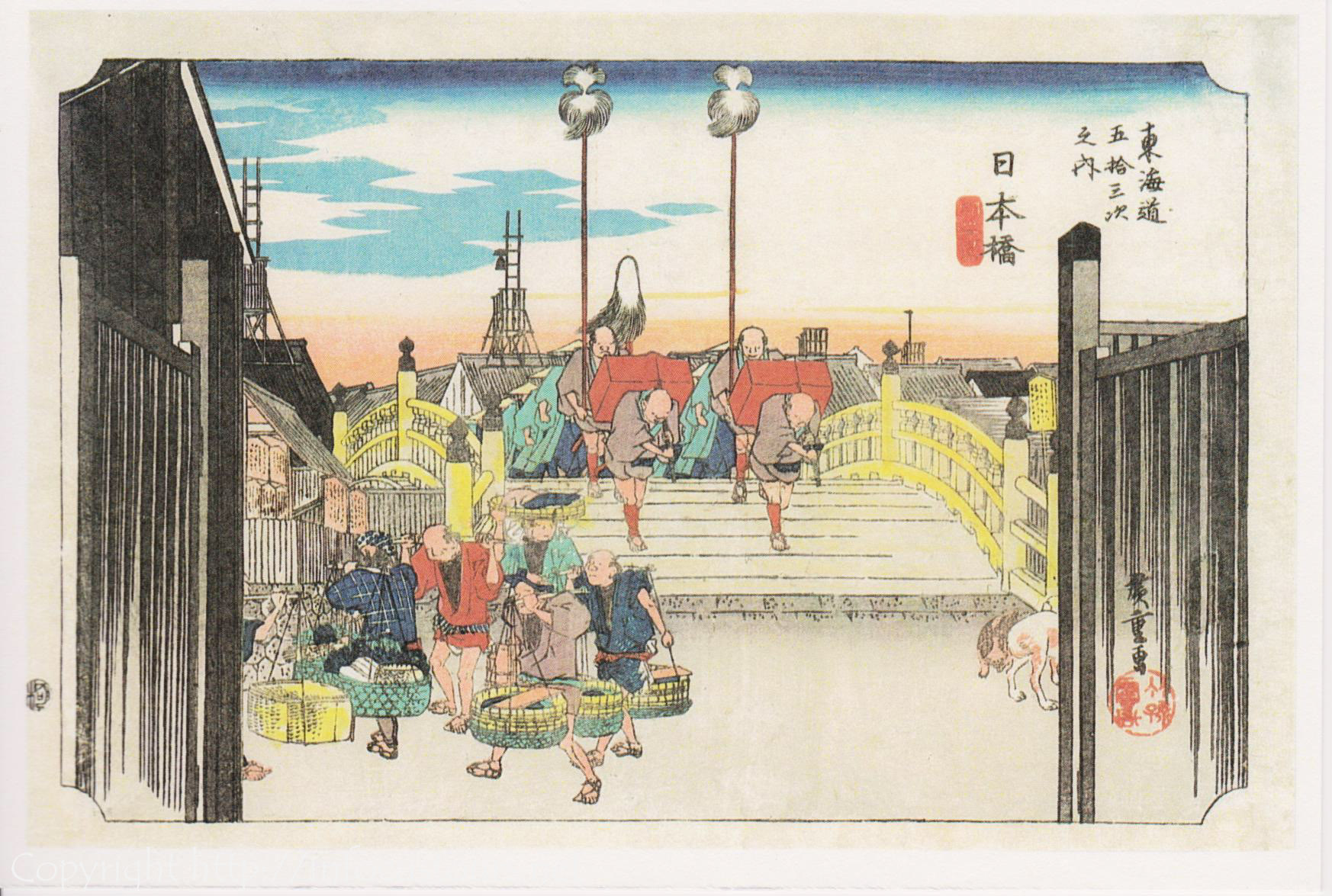 I know the basic history of the famous woodblock art and I also know about the many fakes that circulate the globe. Admittedly, I am no expert when it comes to art history but I was able to find a few discrepancies while scanning through google images and found quite a few copies of the 1st print, the Nihonbashi bridge.