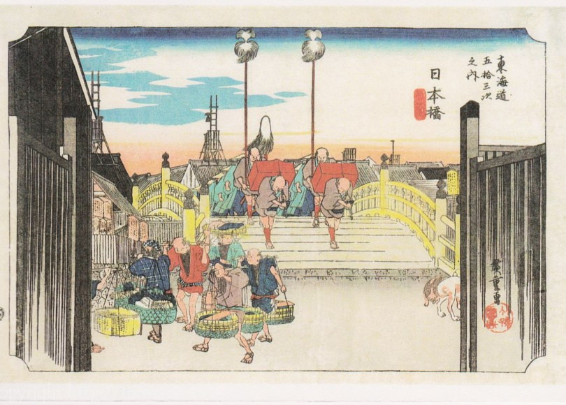 While in Japan in September 2013 I visited Asakusa, Sensoji. While walking down the Nakamise I found a shop specialising in Ukiyo-e. It was like being a kid in a lolly shop. Despite wanting to spend hundreds of dollars I had to settle for one thing. (nod my head to my lovely wife) I bought a hagaki set of the Hiroshige, 53 stages of the Tokaido, something I had wanted to buy for a while.