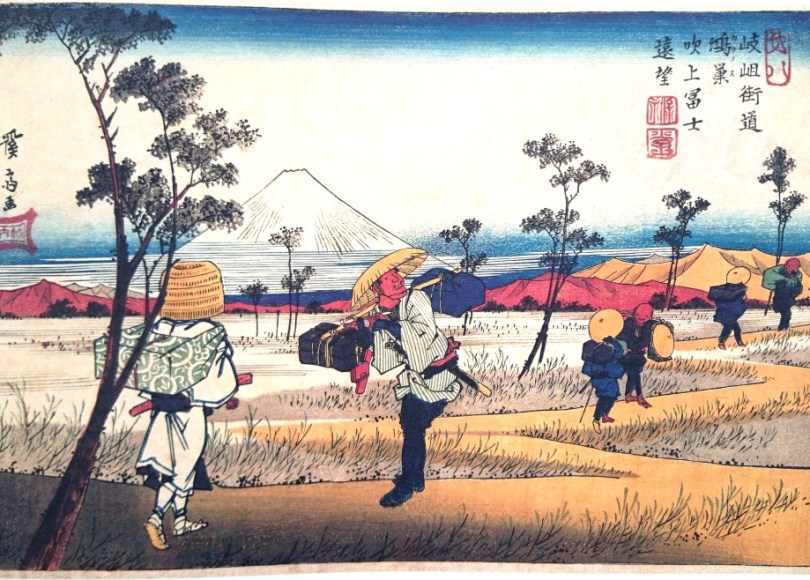 This scene is dominated by Mt Fuji in the distance and the sharp curves of the Kisokaido (walking path). On the left of the print is a Komuso monk wearing a basket shaped straw hat and white attire of a holy man. He is carrying a flute and all his belongings on his back wrapped with a cloth. Komuso are Japanese mendicant monks of the Fuke school of Zen Buddhism, during the Edo period of 1600-1868. Komusō were characterised by the straw basket worn on the head, manifesting the absence of specific ego. They are also known for playing solo pieces on the shakuhachi (Japanese bamboo flute). (Modern Komuso monks below)