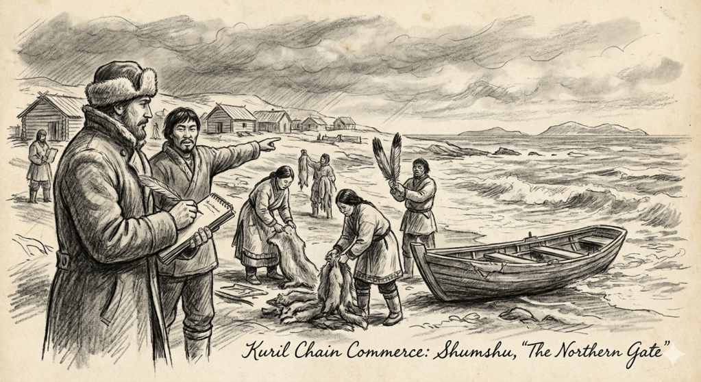 ‘I stood upon the wind-whipped shores of the Kuril chain, recording a world of commerce that would leave the bureaucrats in Yakutsk breathless. My guide, Shatanoi, helped me map this northern labyrinth, where every island serves as a quay for an empire of trade. This is what I have observed and documented. On the first island, Shumshu, I found the Kuril people living amidst the salt and spray. They are the keepers of the northern gate.