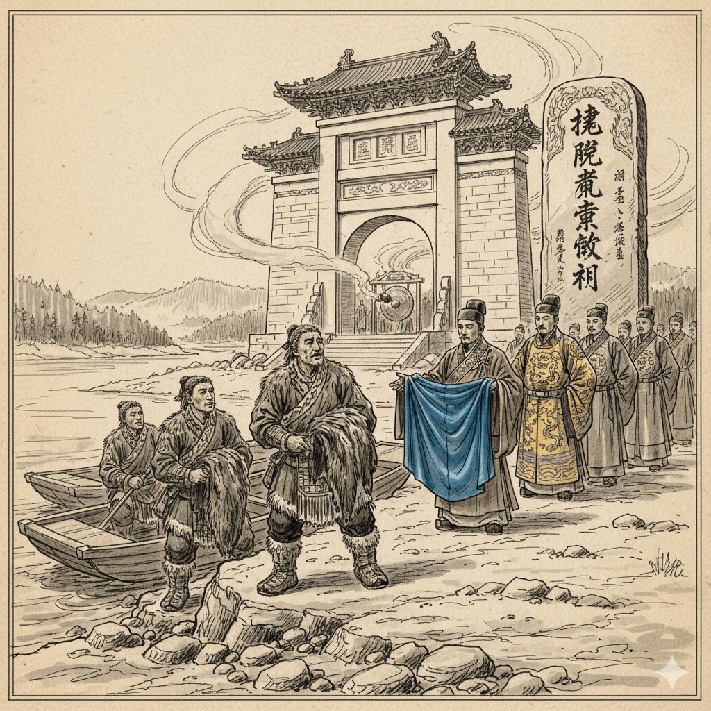 As their vessels touched the rocky riverbank, the air was filled with a sound the Ainu had never heard. It was the deep, resonant drone of a Buddhist gong. It vibrated through the hull of their boats and into their very spirit. Standing before the temple gates was a line of Ming officials in heavy, embroidered robes that shimmered with threads of real gold. Behind them stood the “Silent Sentinel”, the great stone stele, its surface fresh with sharp, black ink.