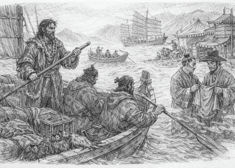 Moving to the second island, Paramushir, the trade grows even more sophisticated. Here, the Kuril arrive from the remote reaches of the south, their boats laden not with raw furs, but with luxuries, fine silk, sturdy cotton textiles, iron swords, cooking pots, and delicate ceramics. It is a mirror of civilization in the middle of the sea. The people of the third island, Onekotan, are the true linguists of the north. They sail frequently to the Kamchatka mainland to hunt for pelts, and because they trade and intermarry so freely with the Kamchadal, they speak their tongue as if it were their own. I saw many Kamchadal women among them, and heard of many Kuril daughters sent to the mainland to wed.